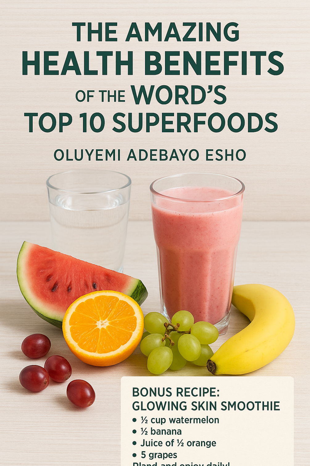 In this beautifully written and inspiring ebook, The Amazing Health Benefits of the World’s Top 10 Superfoods, wellness enthusiast Oluyemi Adebayo Esho invites you on a gentle journey back to natural healing through simple foods, hydration, and everyday choices.